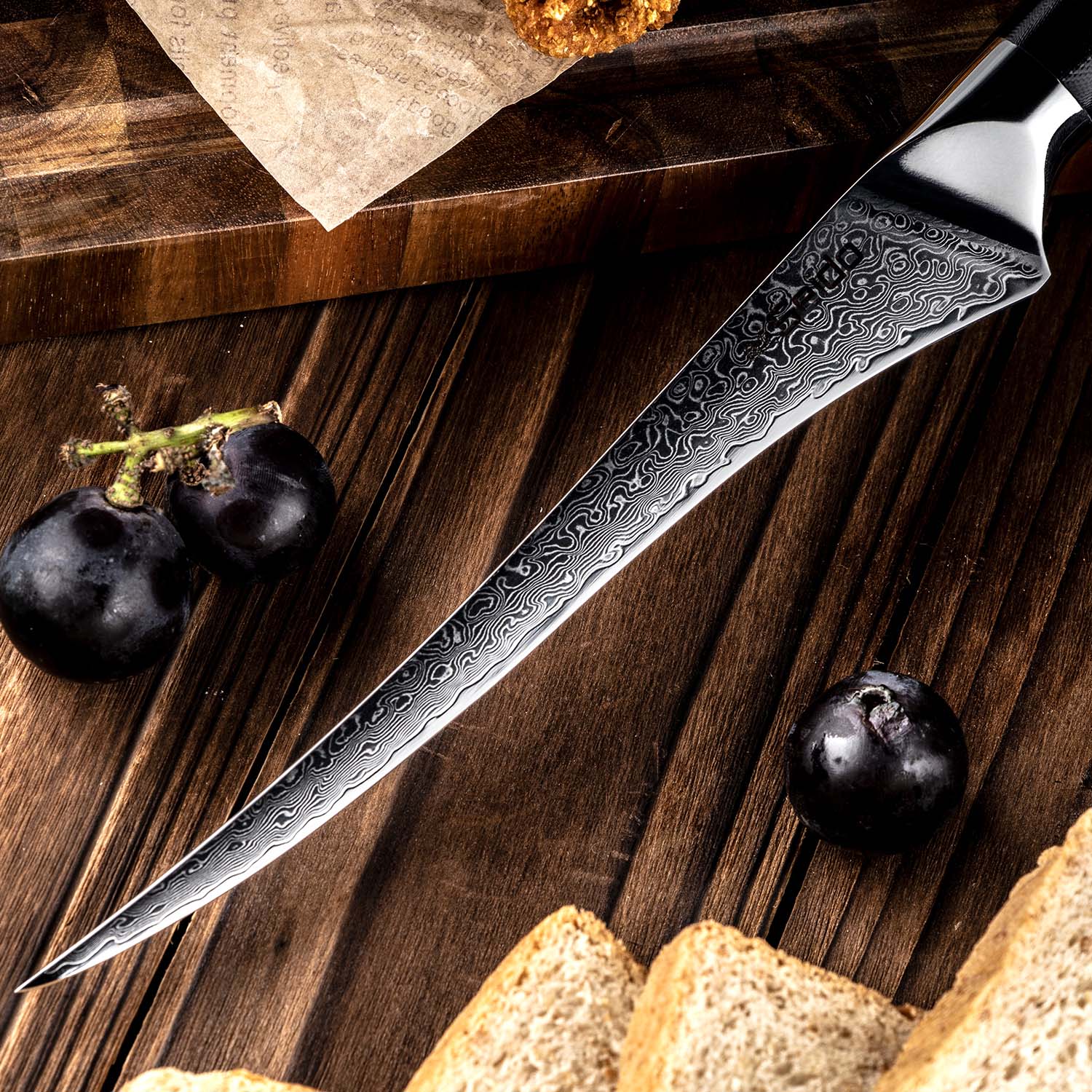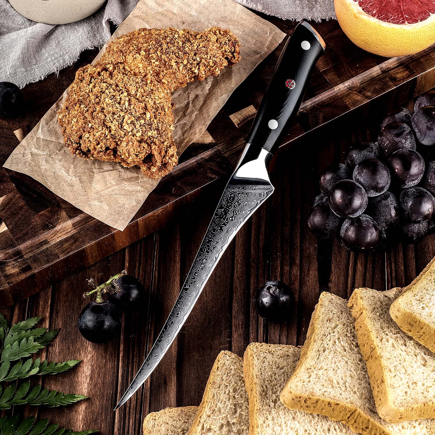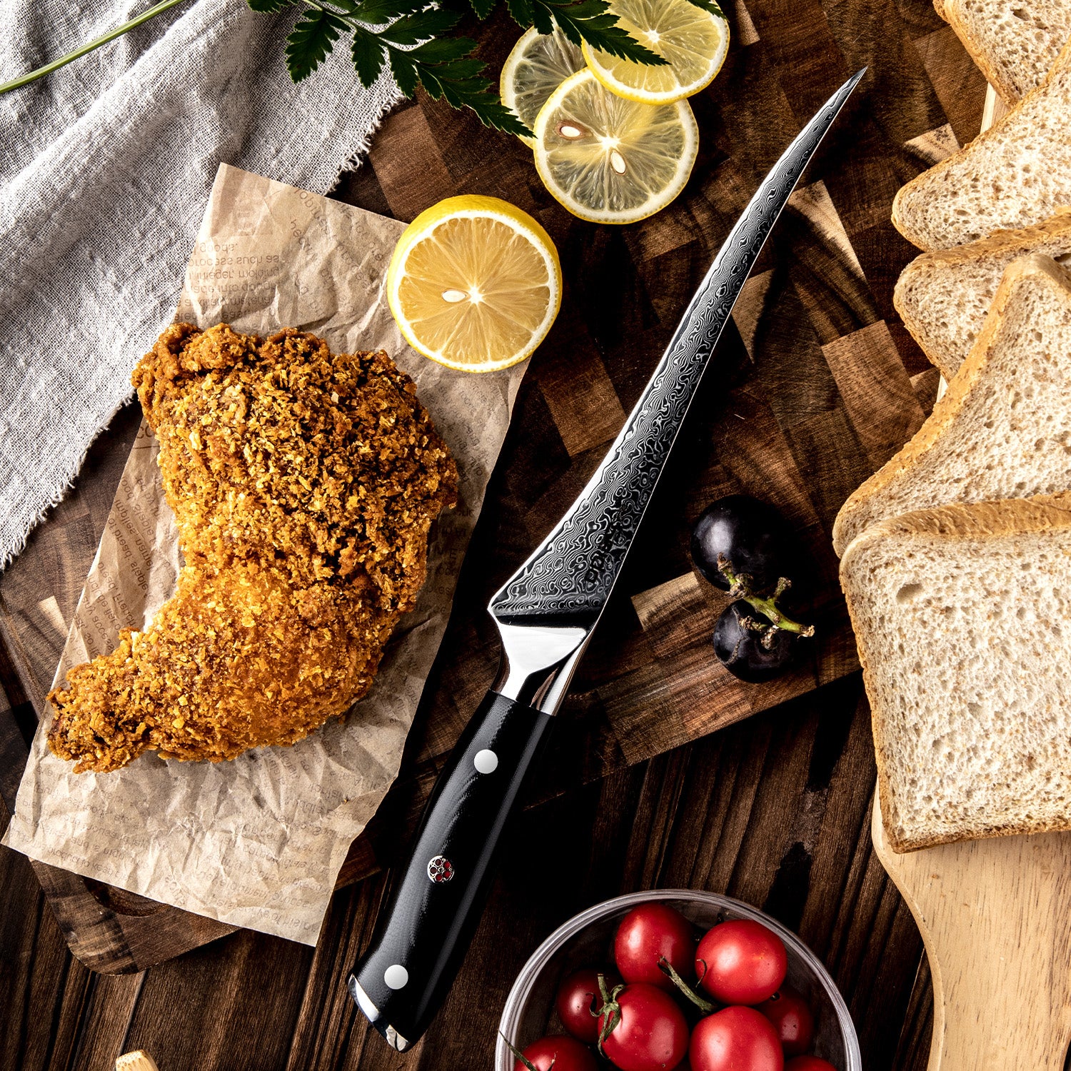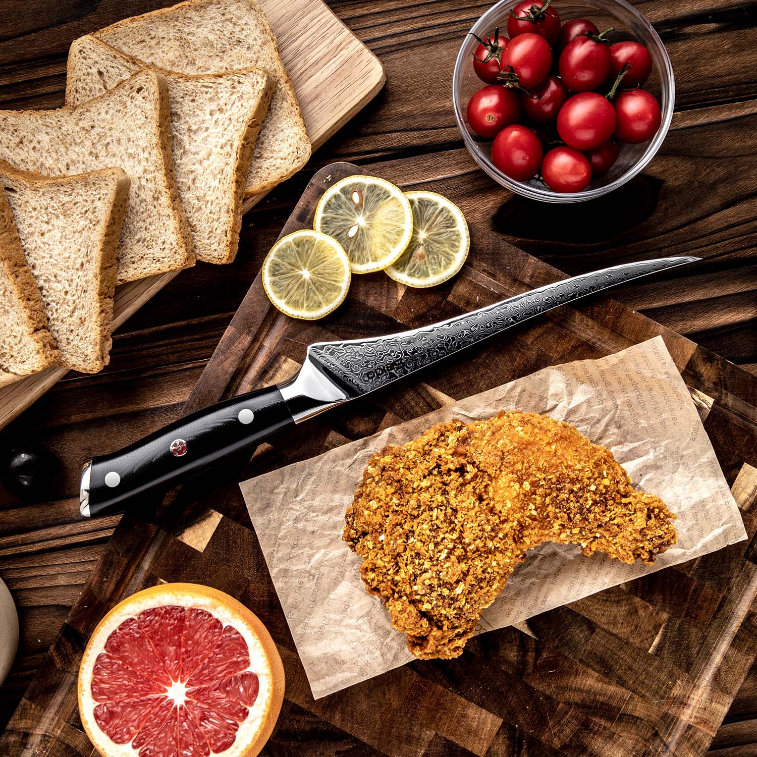 Our stunningly sharp Damascus knives are visually impressive cutlery tools. This best selling knife integrates a distinctive blade and smooth, resinous handle, combining an attractive style and dependable functionality.