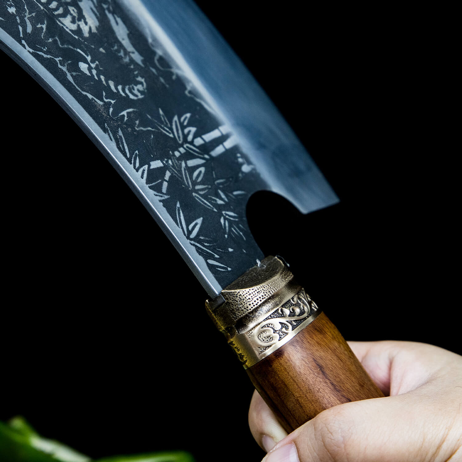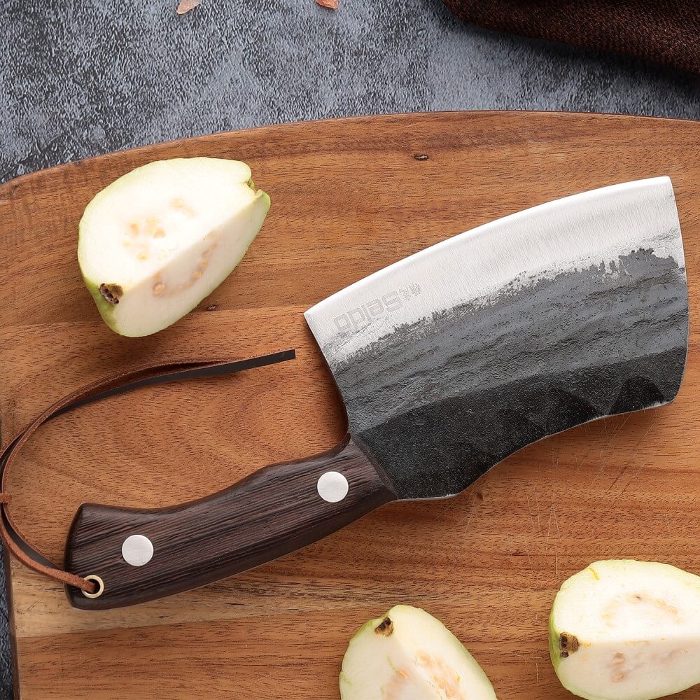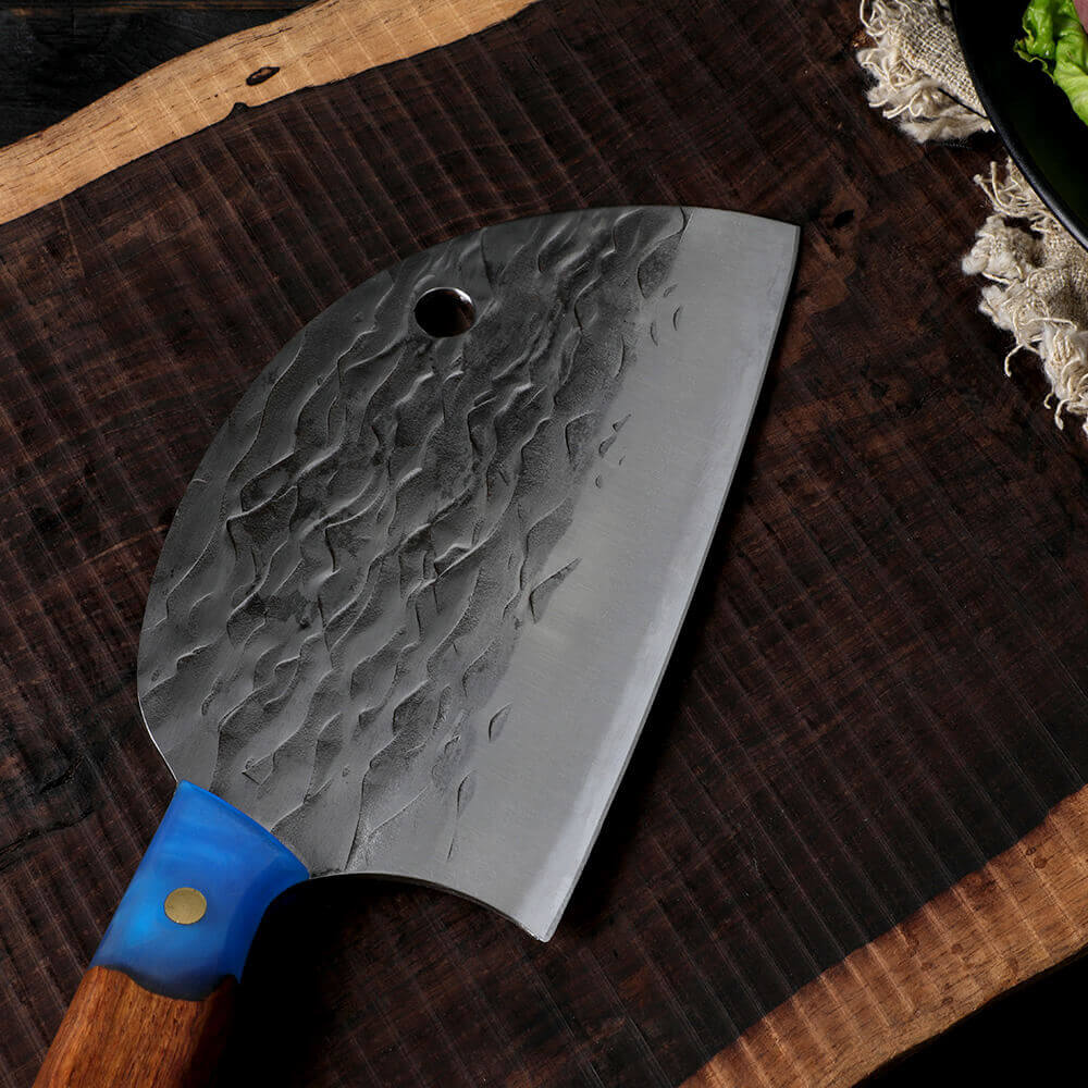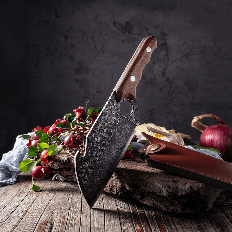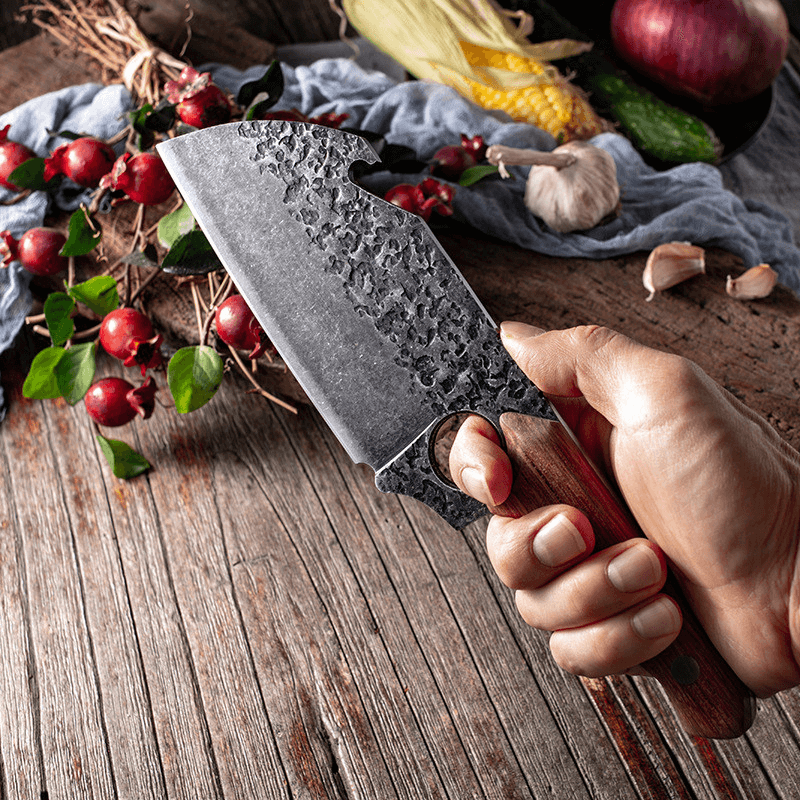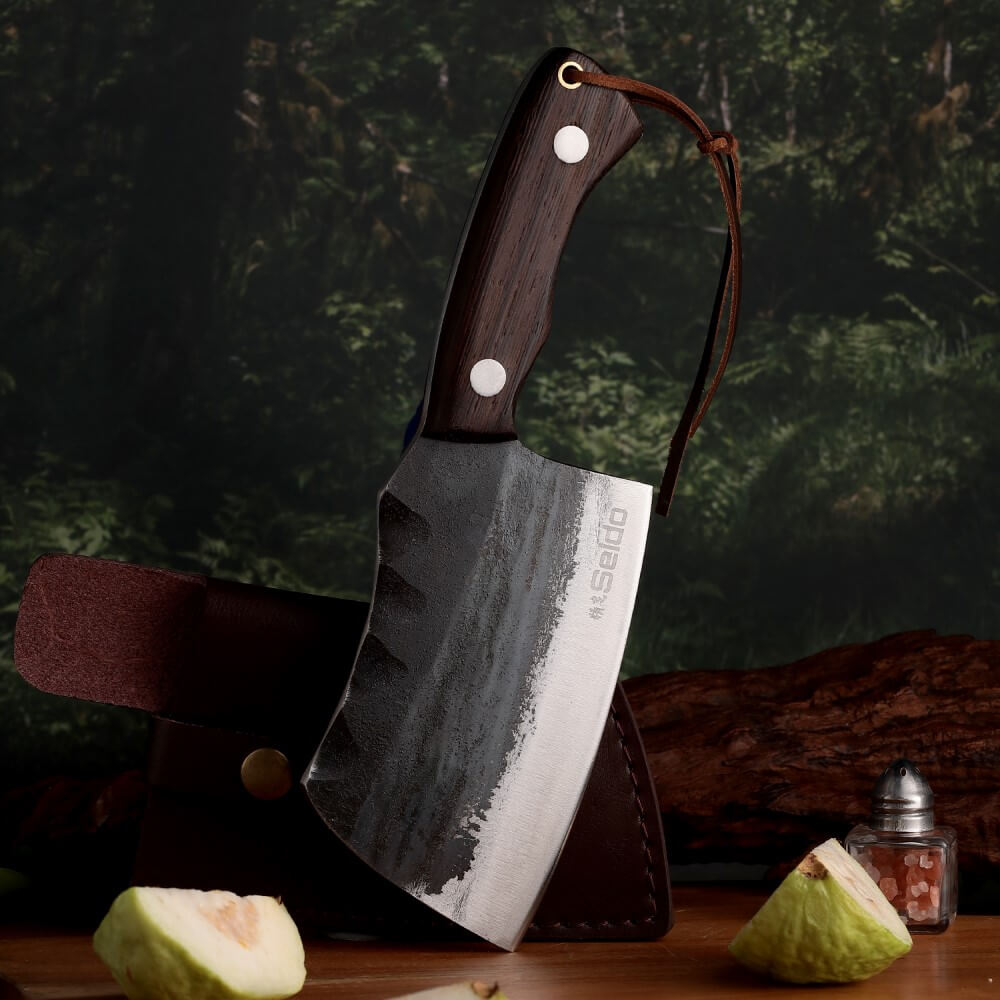 Regardless of whether you choose indoor or camping knives, some butcher knives will have a hole in the blade near the handle. This adds more stability to the cleaver knife. If the blade becomes stuck, slip one or two fingers into the hole to get a better grip and pull out the blade.