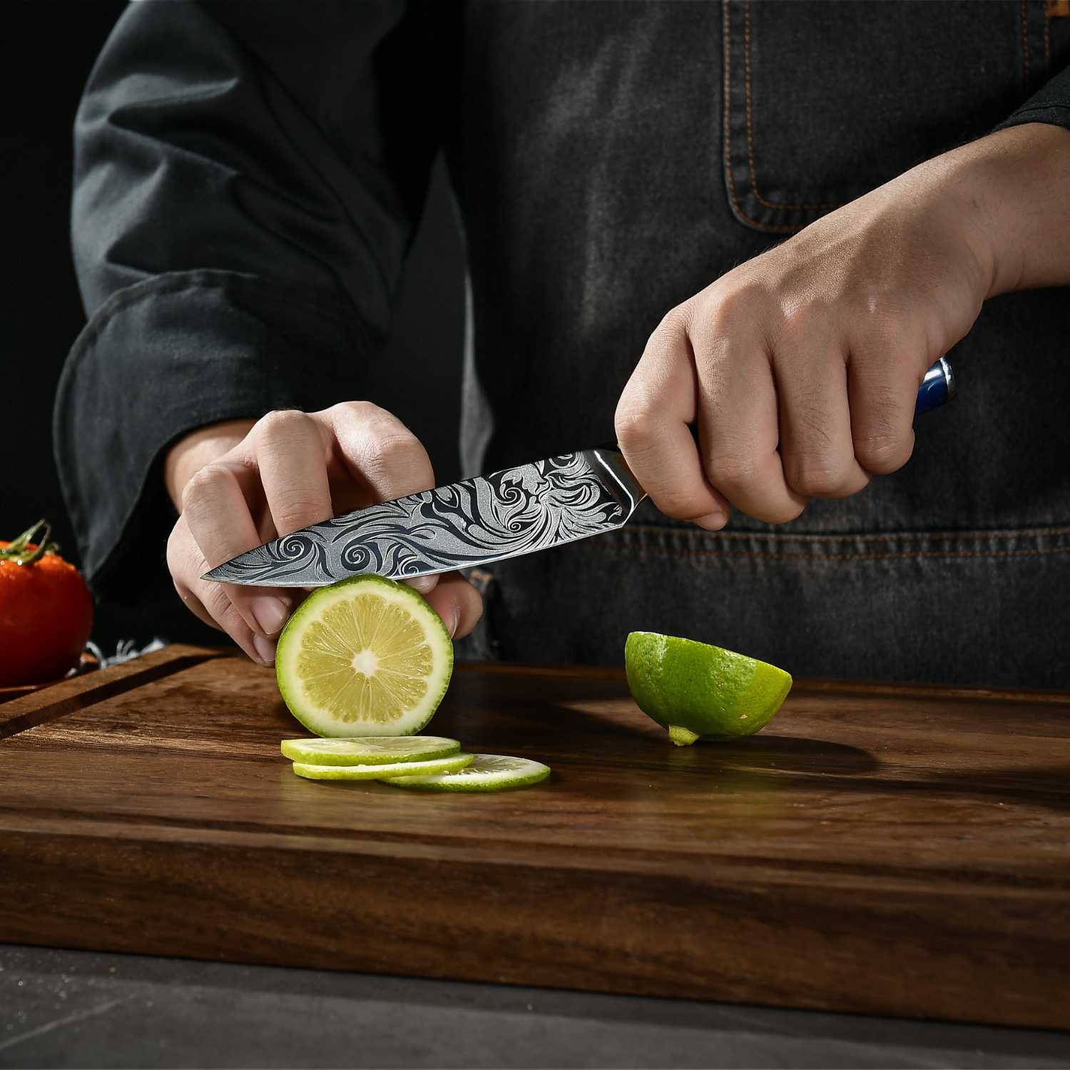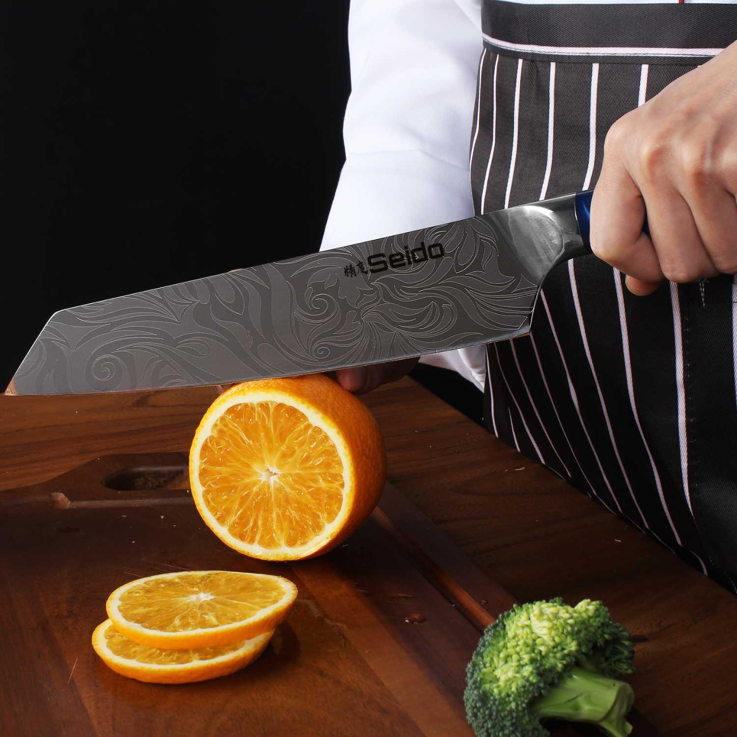 The team at Seido Knives has over 100 years of culinary experience. Japanese blacksmiths hand-forge each knife to be precisely balanced. These knives have a sharp cutting edge, perfect for precision cutting.