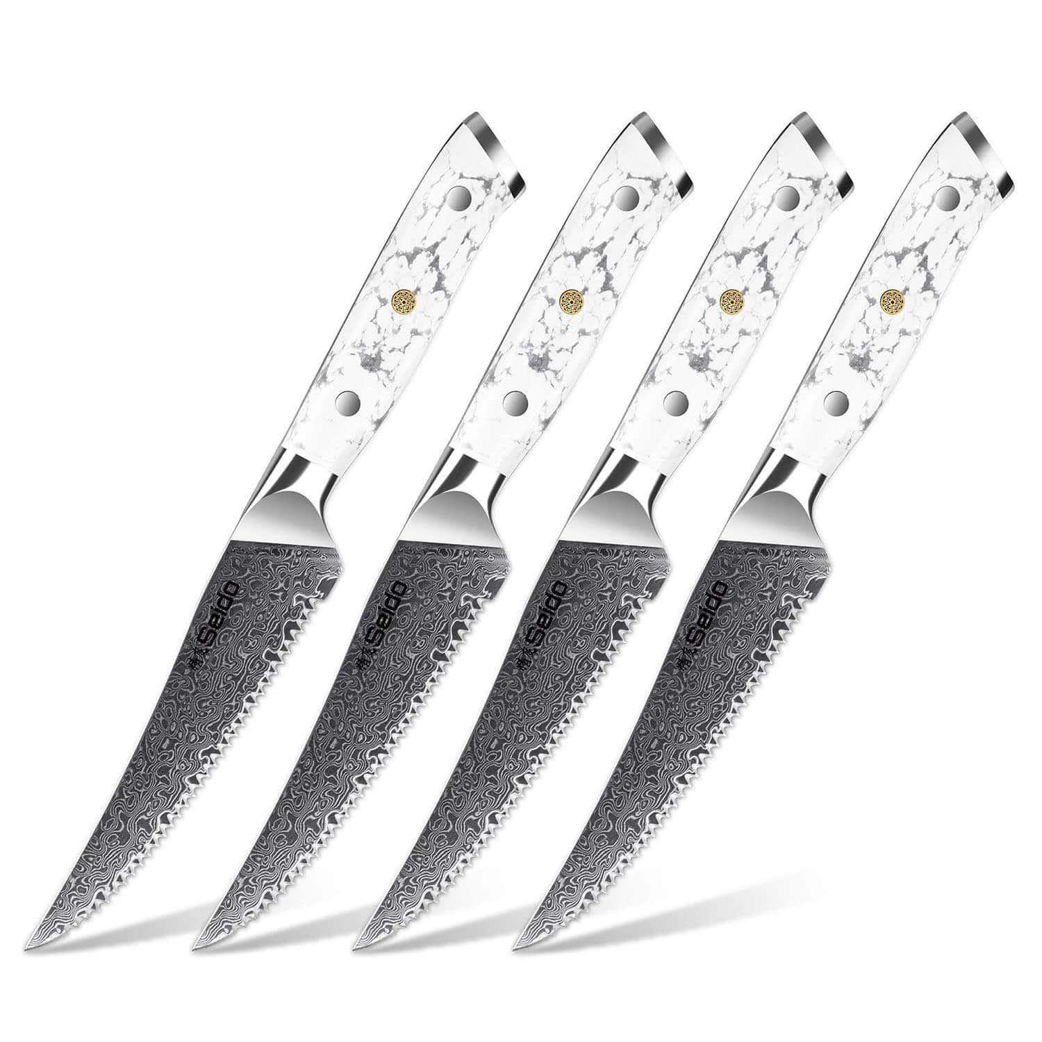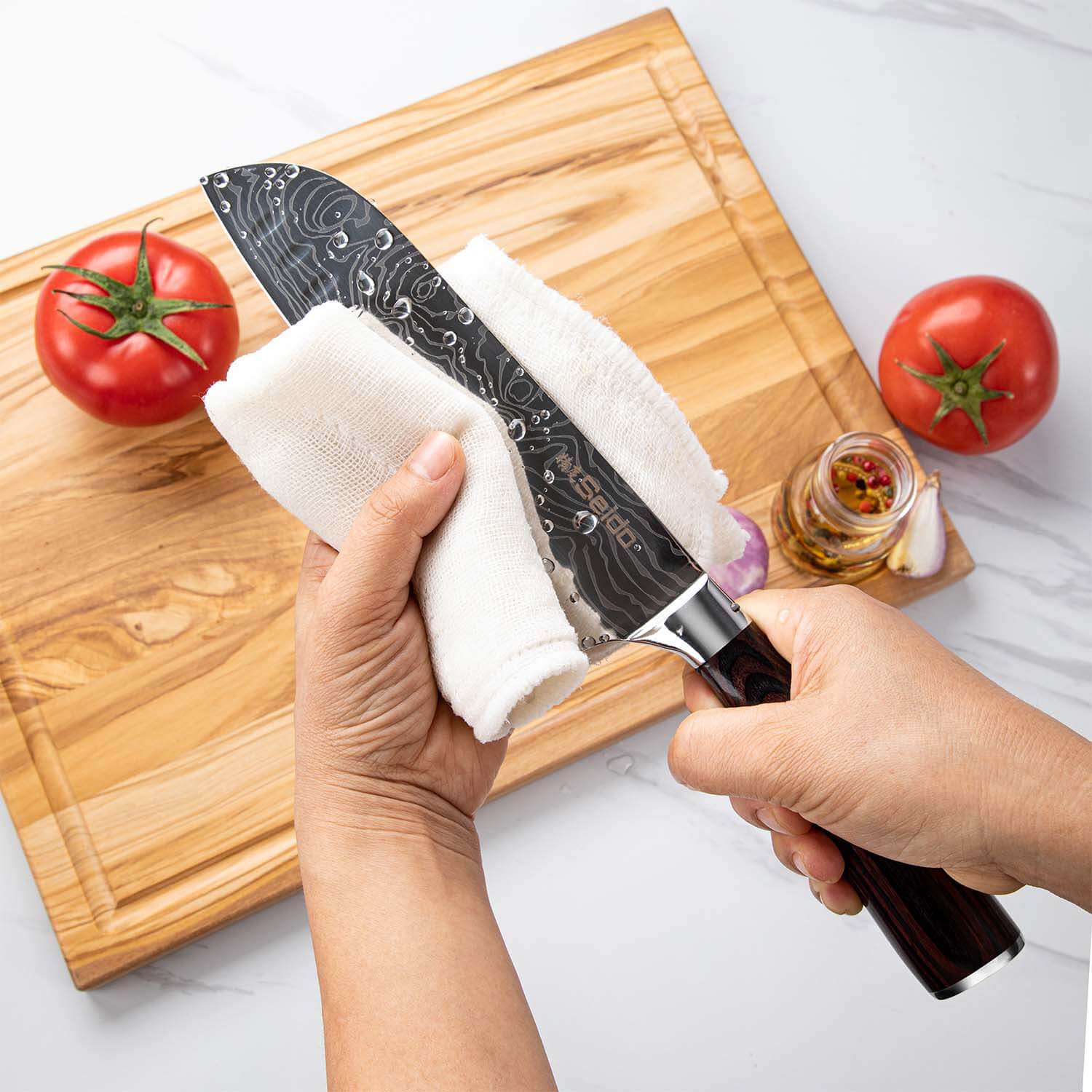 Washing these knives in the dishwasher could damage the blades and handles. Instead, we recommend hand-washing your knives and drying them before placing them in the block.