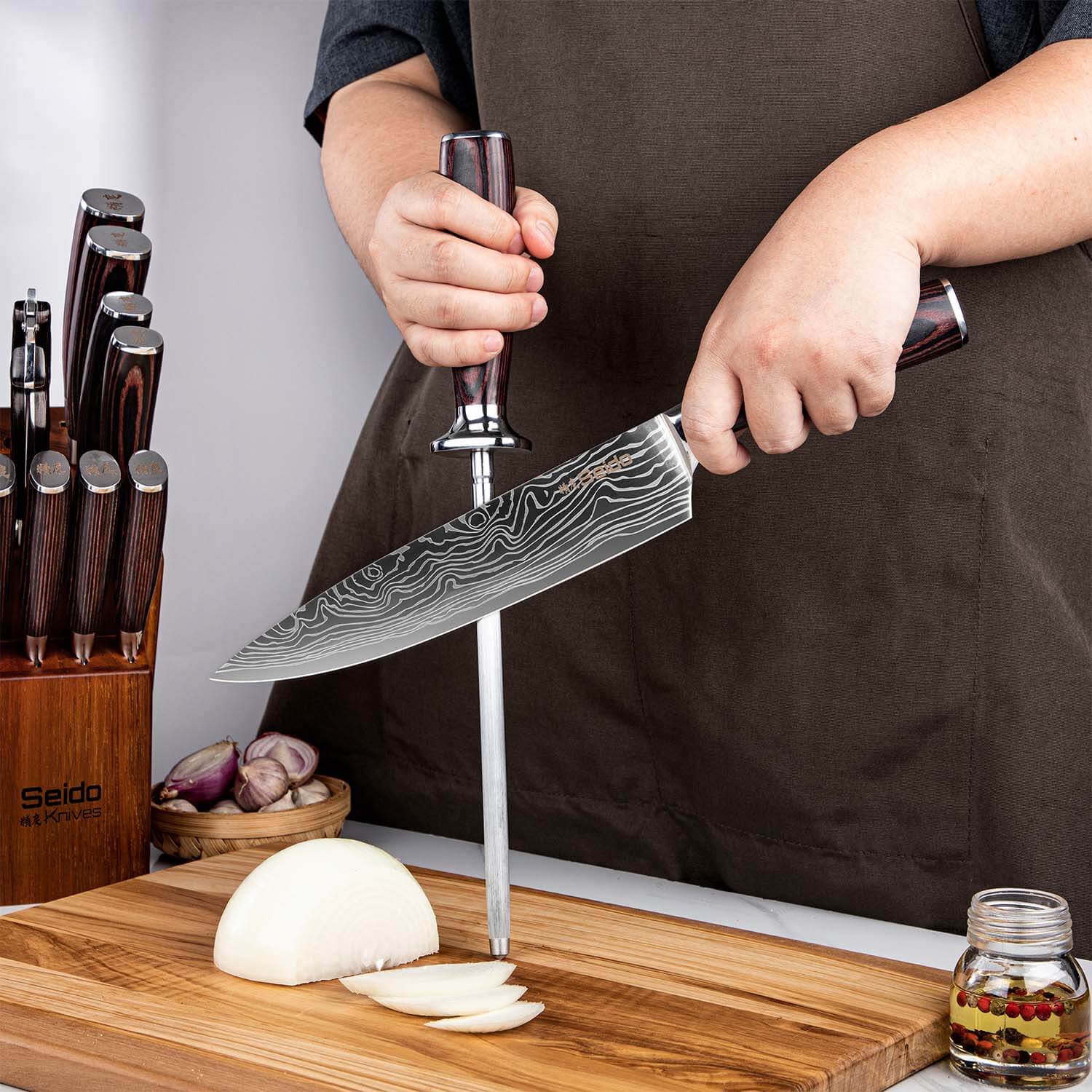 Knife sets with blocks make knife storage a breeze. Instead of carrying a knife roll bag, you'll store your knives in a functional versatile wooden block that protects the blades from heat, abrasion and moisture. You also protect your fingers too from accidental cuts.