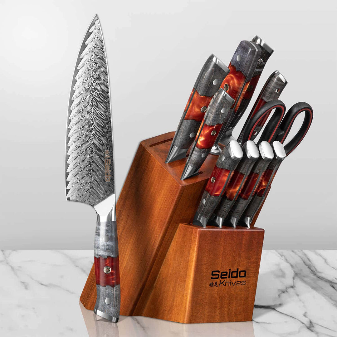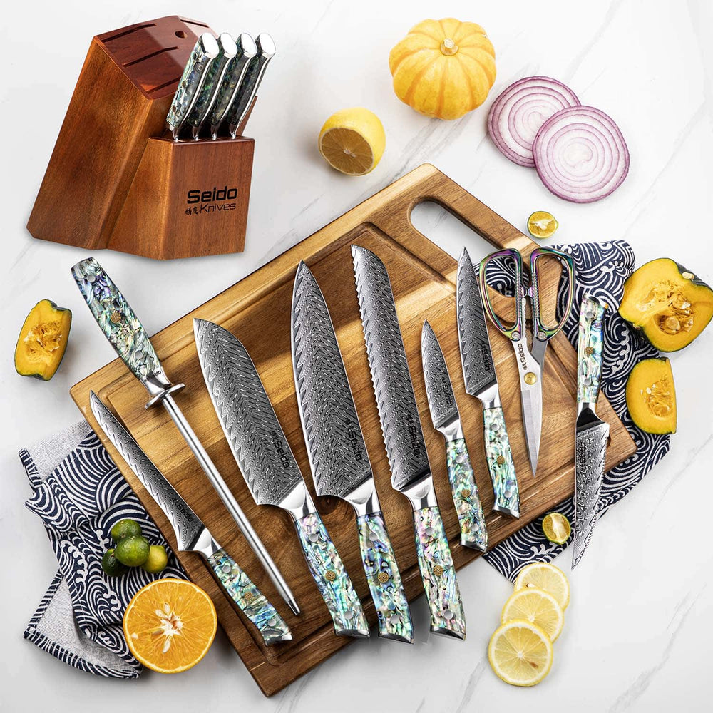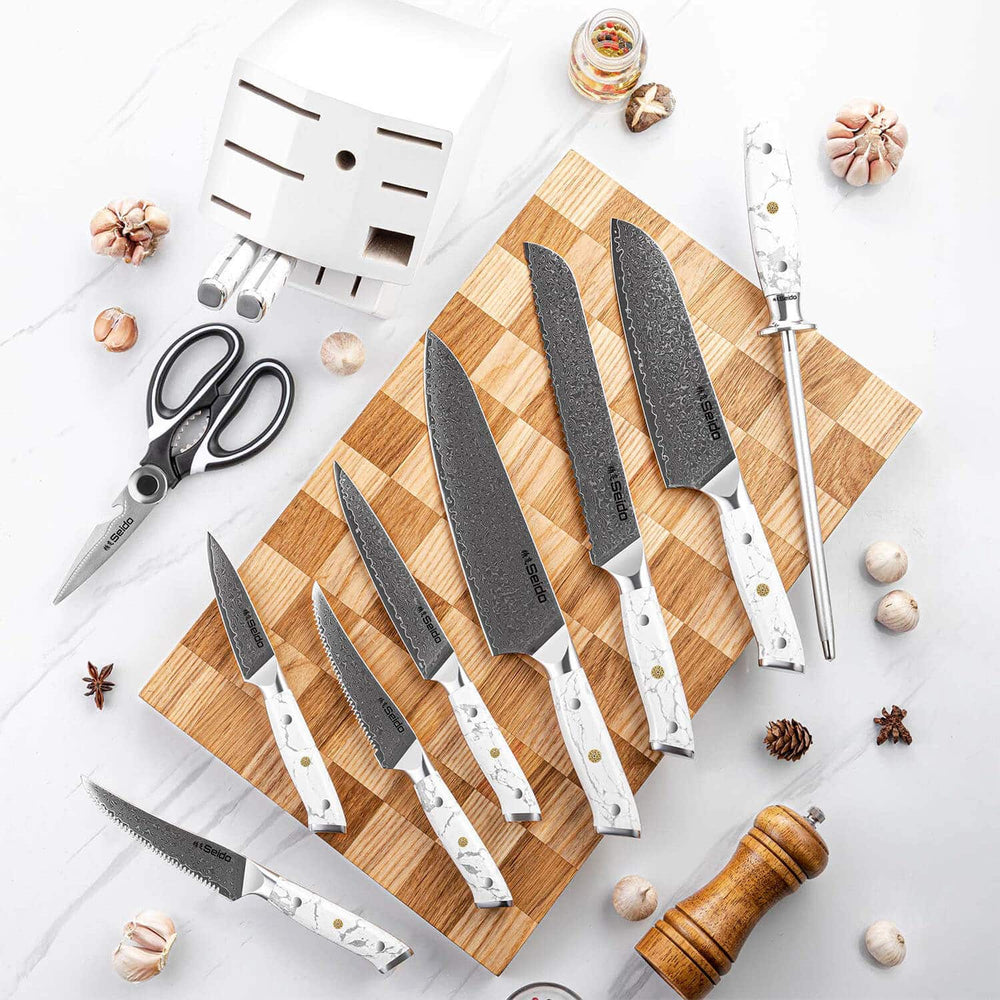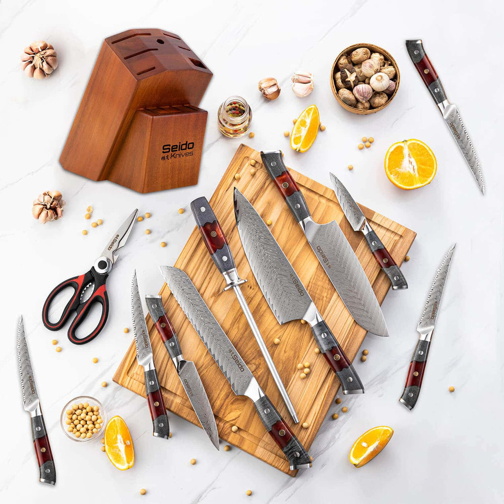 Our Japanese knife block sets are the ultimate chef tools, designed to handle every cooking task, from precision slicing to heavy-duty chopping. Each set includes essential knives for a typical meal prep—chef's, Nakiri, a Santoku knife, boning, serrated utility knife, and more—ensuring you're fully equipped for any cooking challenge.