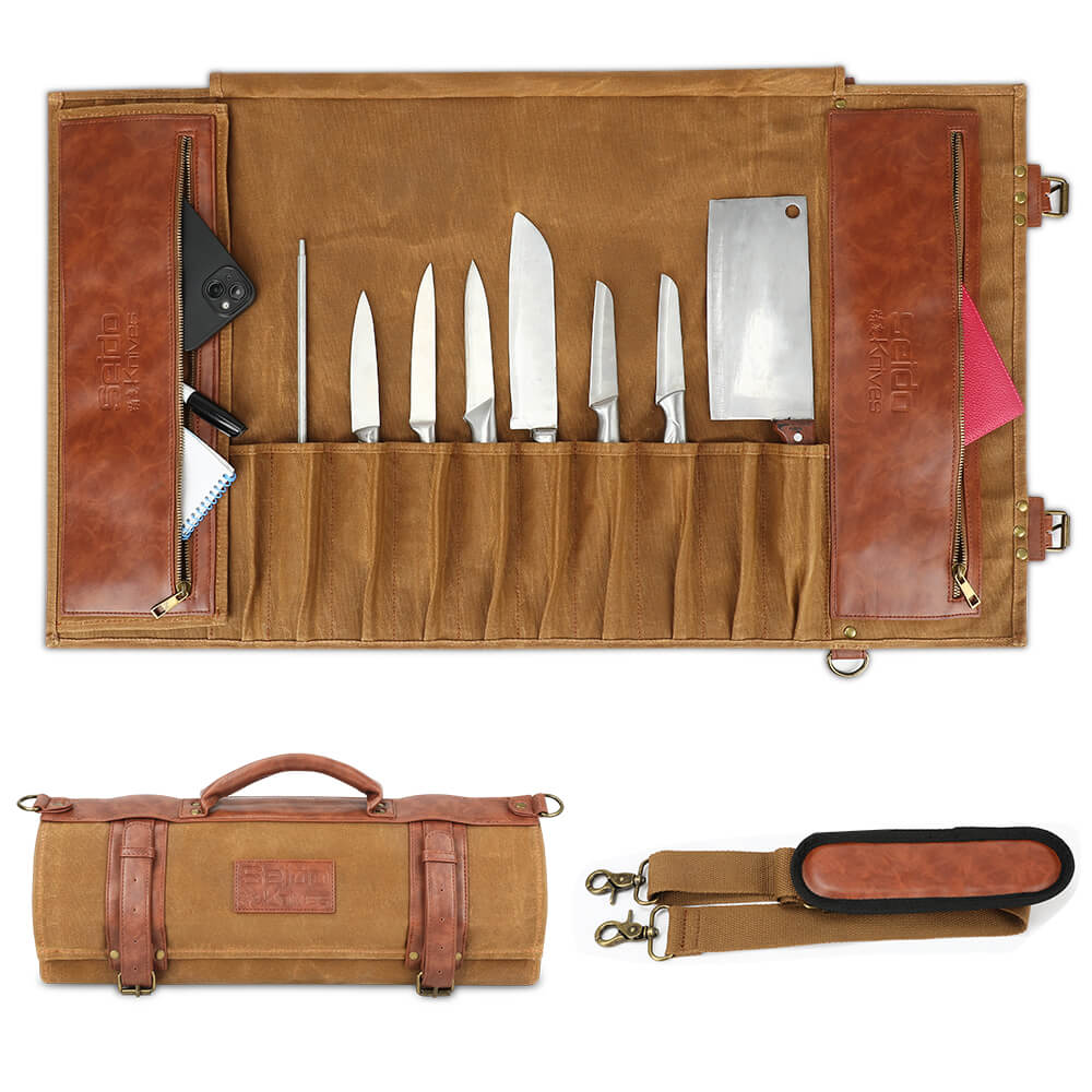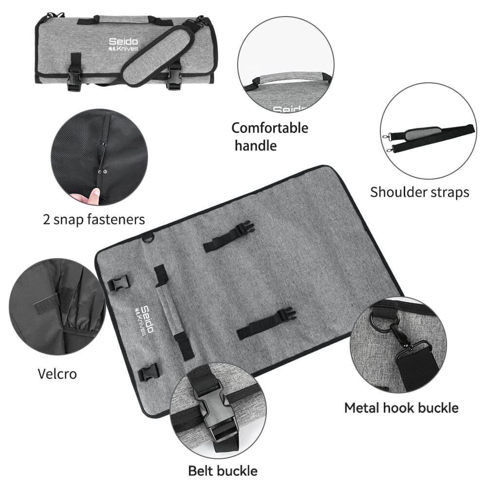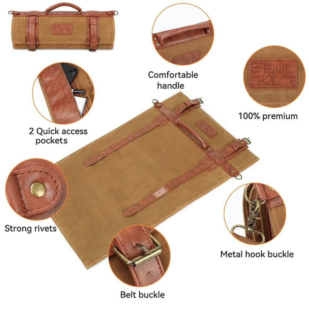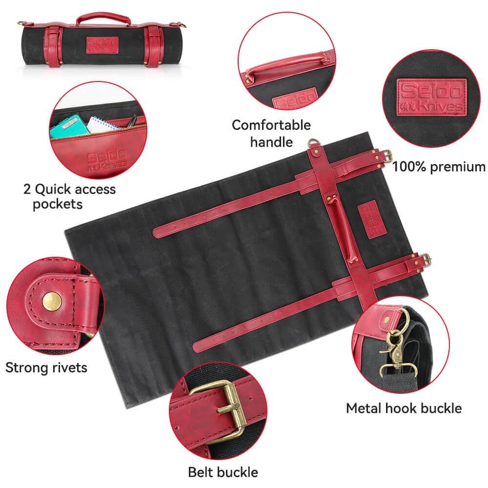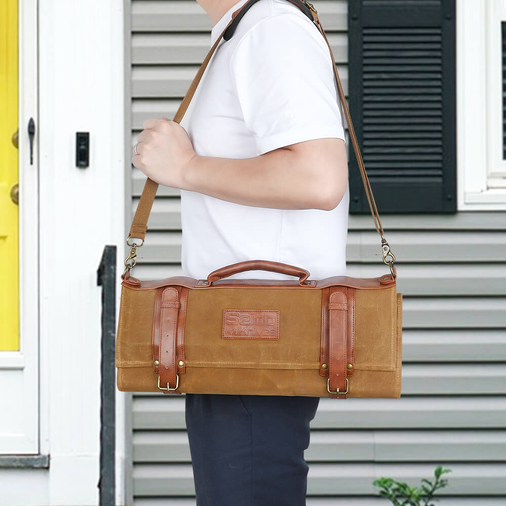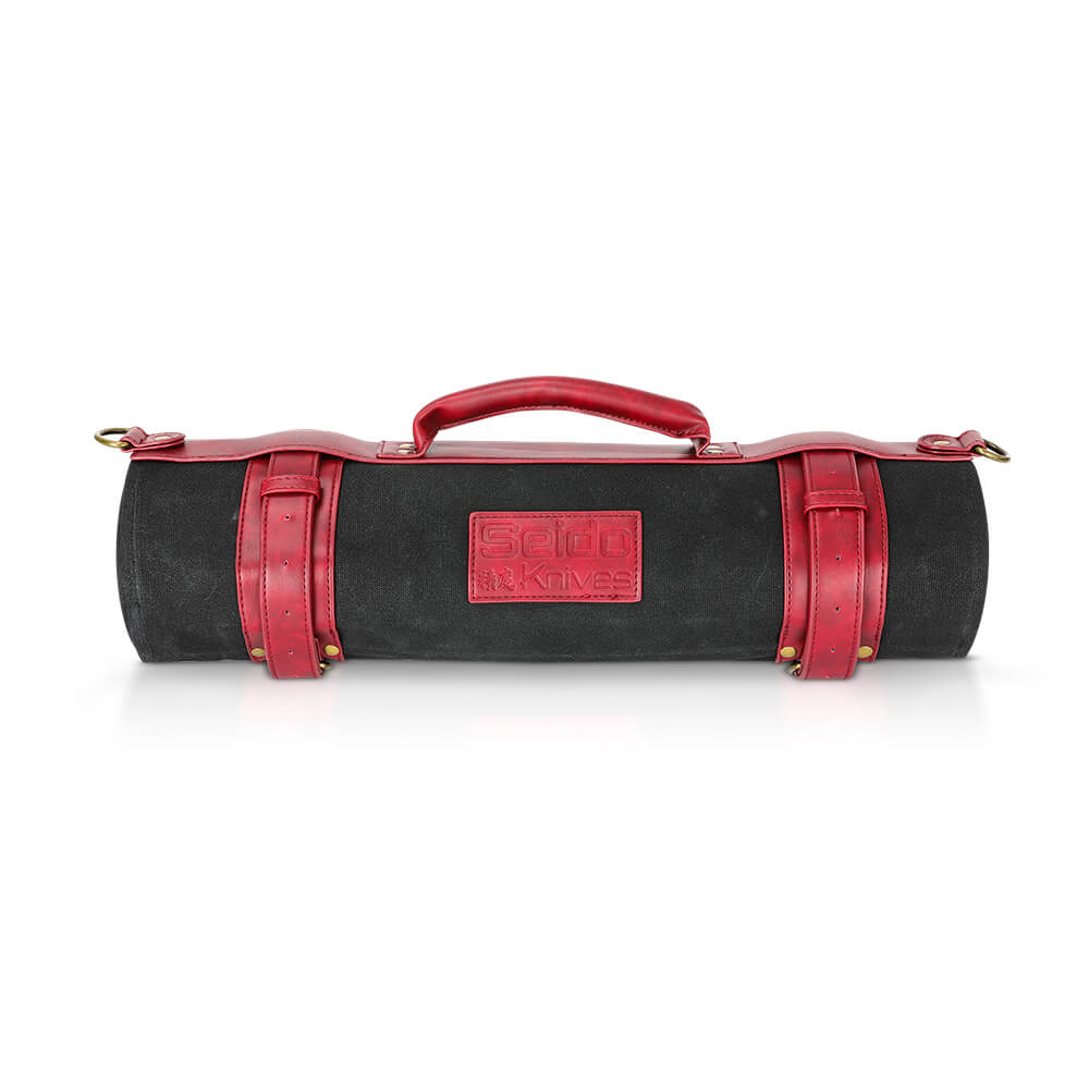 At Seido Knives, we offer a classic chef's knife bag made from heavy-duty canvas. It can carry up to 12 large knives and has four additional slots for other tools and utensils. The chef's knife case also comes with an elastic band around the slots to keep your knives securely in place.
