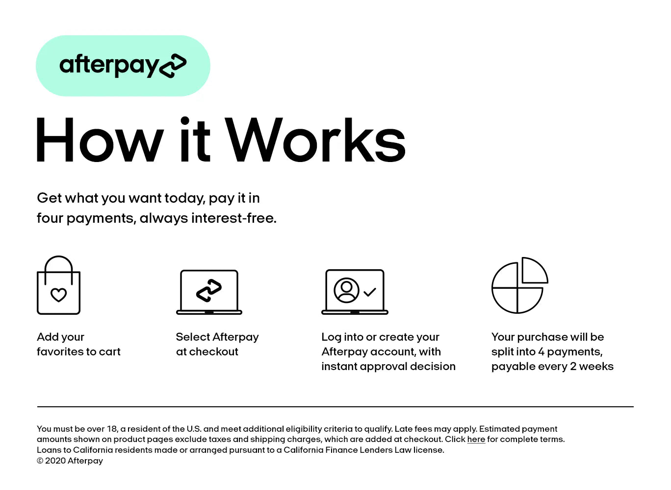 If you would like to know more about Afterpay, visit the Afterpay website www.afterpay.com for a comprehensive list of FAQs, terms, instalment agreement well as Afterpay’s Privacy Policy which can be found at https://www.afterpay.com/ privacy-policy.