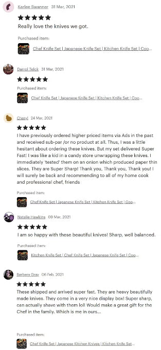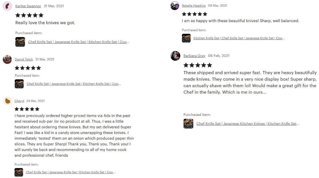 Just got these knives and they're great. Super sharp and fantastic looking. Would recommend 👌