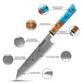 Close-up of blue and wood handle chef's knife with Damascus steel, wood, and resin. Available today at Seido Knives!